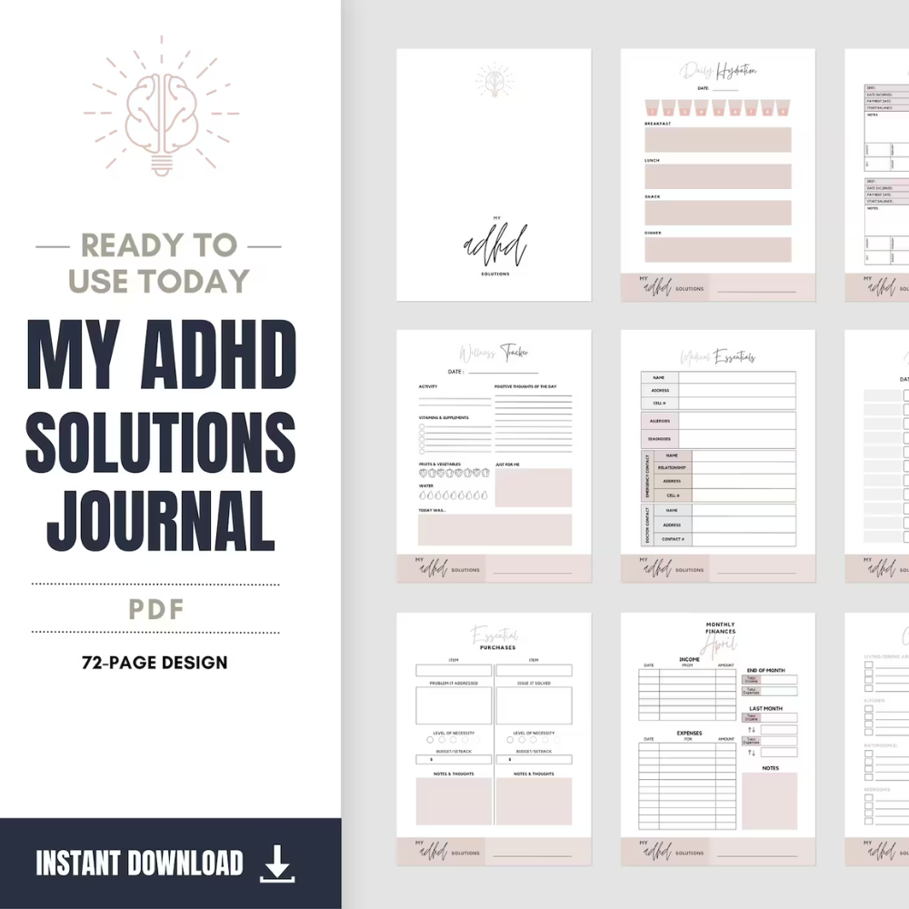 ADHD Journal, Focus Tracker, Printable Planner, Mindfulness Log, Daily Organizer, Wellness Diary, Mental Focus, Task Scheduler, Brain Health, Productivity Aid, Customizable Log, Cognitive Support, Planner Inserts