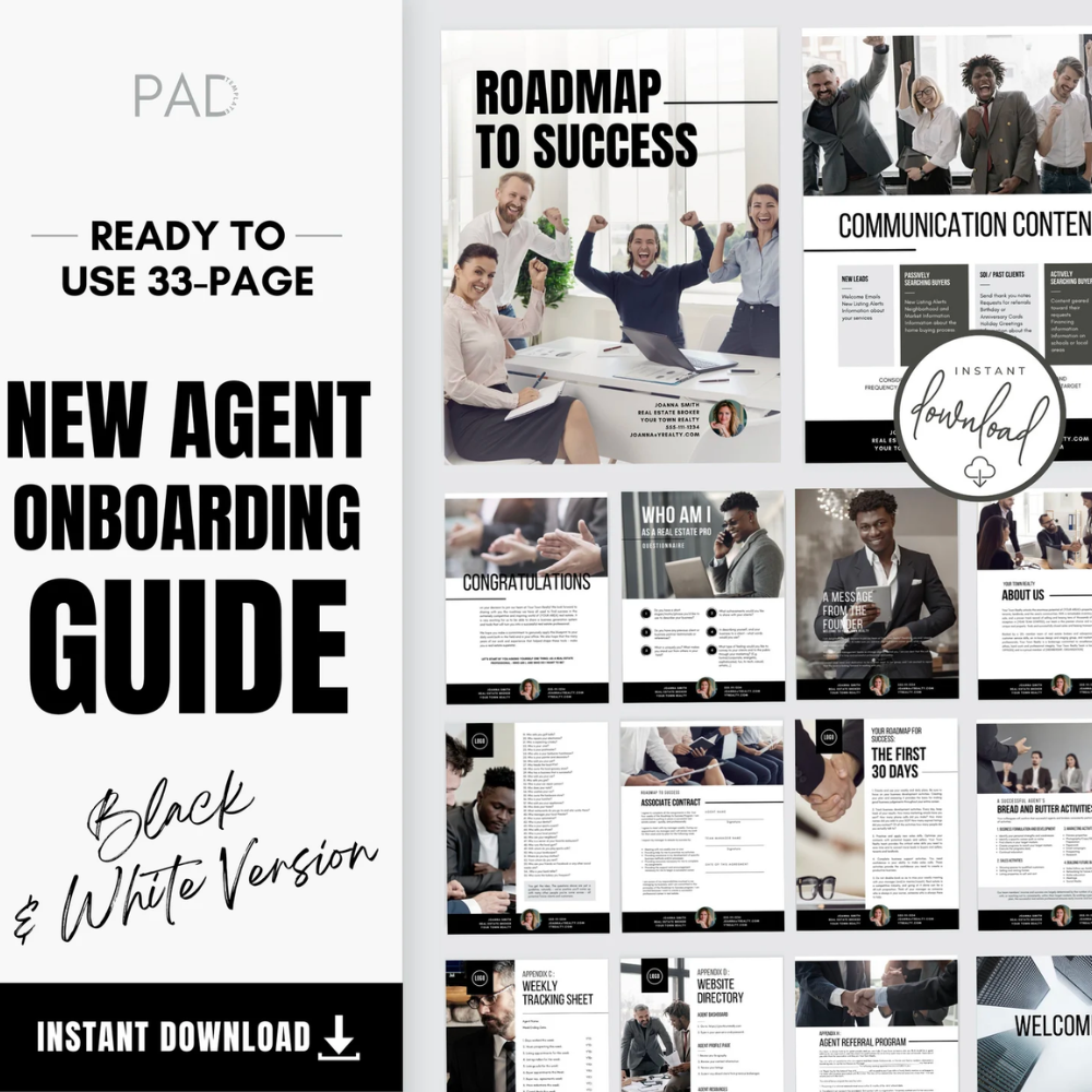 Are you looking to grow your real estate team or your brokerage? This real estate agent team member on-boarding guide will help you expand your group and strengthen your recruiting efforts and retention. Here is a beautifully designed, helpful tool to help you attract and support just the right team candidates. Let your marketing shine and show your team members your marketing know-how. Impress upon them, with ease, that you are the best choice for them from day one of joining your group. In this day and age of difficult hiring, this guide is exactly what your recruiting effort needs to flourish. Help your newbie, a new Realtor or new team member, get oriented, properly on-boarded and heading in the direction of success in the industry from the gate!